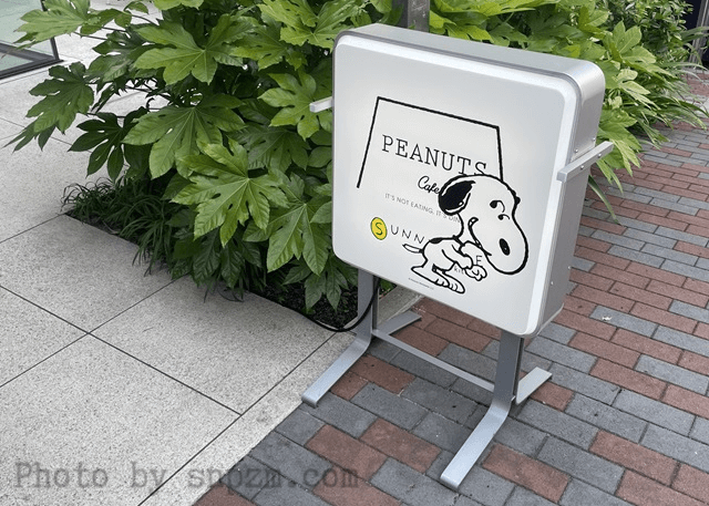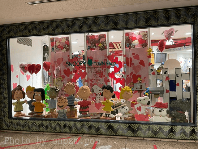 お店の前は季節に合わせて可愛いデコレーションがされていて、スヌーピーの巨大バルーンが出迎えてくれます。